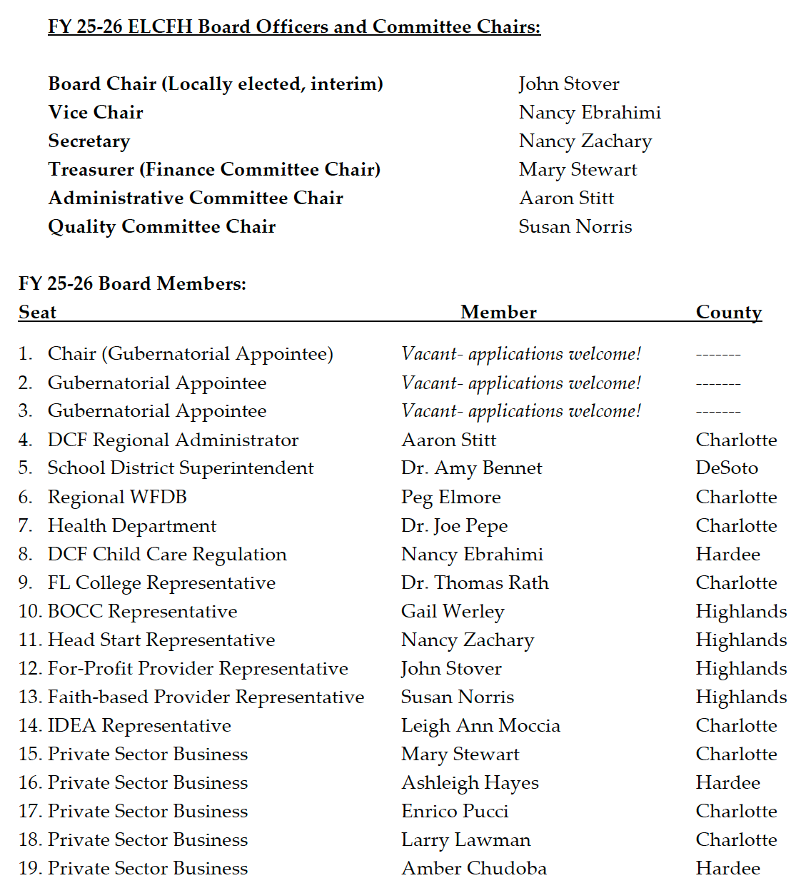 The ELCFH serves families in Charlotte, DeSoto, Hardee and Highlands Counties