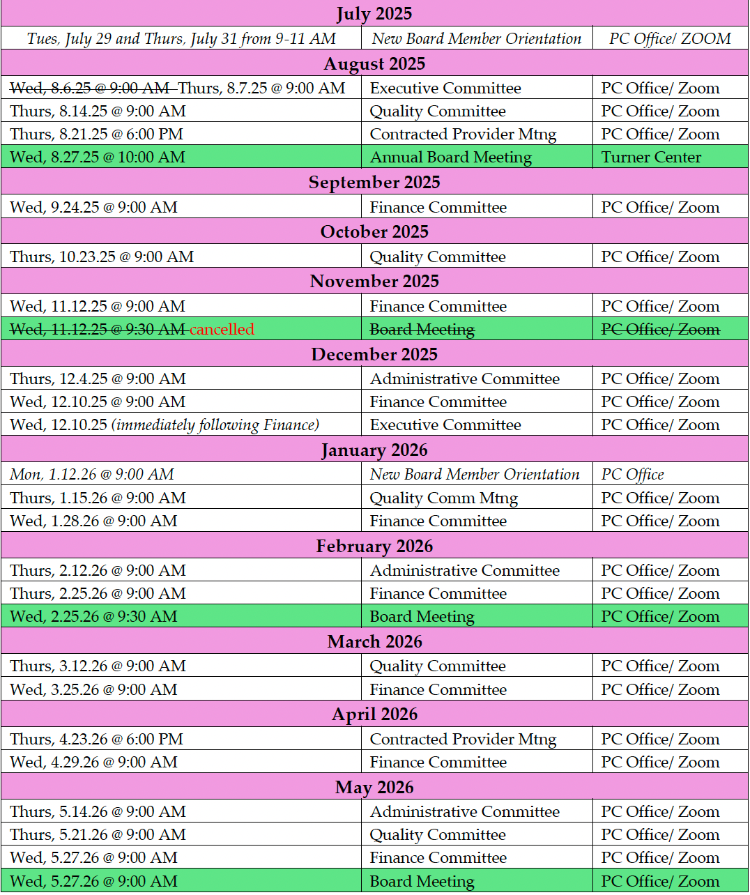 ELCFH Board and Committee Meeting Calendar