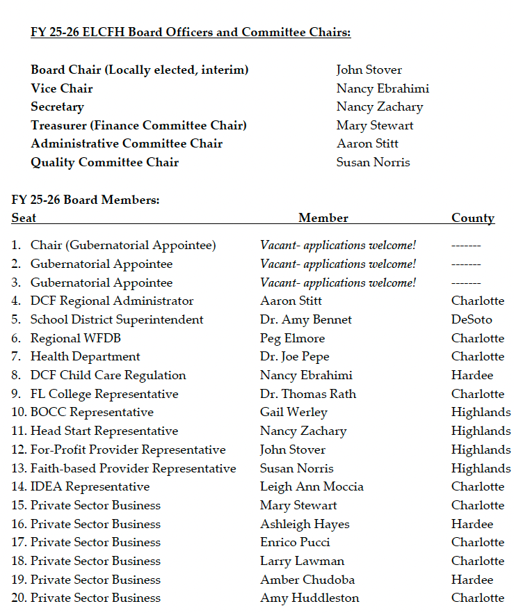 The ELCFH serves families in Charlotte, DeSoto, Hardee and Highlands Counties