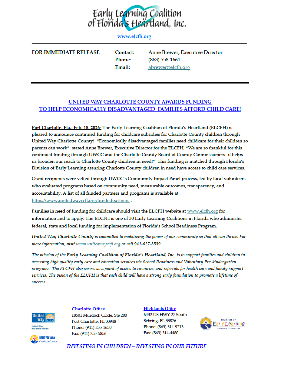 United Way Charlotte County awards funding to help economically disadvantaged families afford child care!